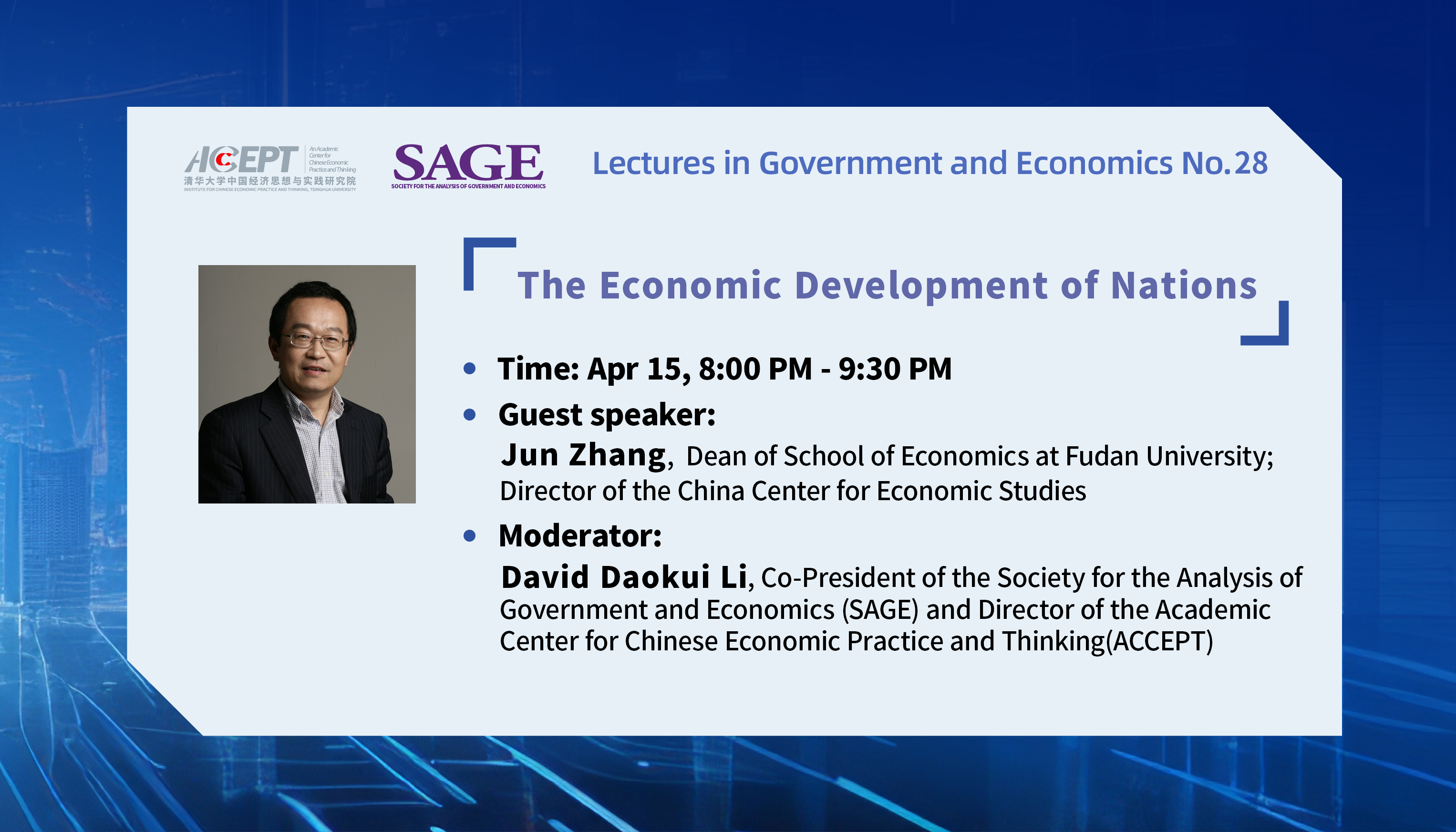 The Society for the Analysis of Government and Economics, SAGE, aims to promote academic research in the subject of government and economics, including topics such as the incentives, behavior, and role of the government in an economy. The Society is a disinterested, academic organization avoiding political, social, commercial, or nationalistic bias. The inaugural co-presidents of SAGE are 2007 Nobel Laureate Harvard Professor Eric S. Maskin and Professor David Daokui Li of Tsinghua University. The Society has an open international membership from countries such as the United States, Europe, China, and other developing countries. Main activities of the Society include organizing academic conferences and publishing an academic journal.